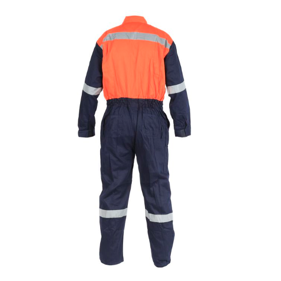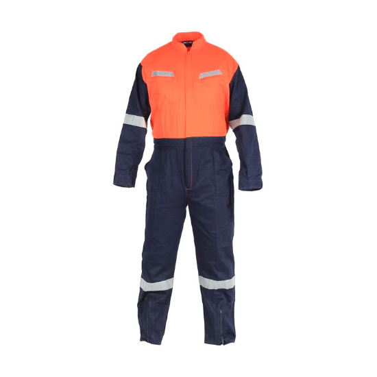 Buzo estilo piloto fabricado en poplin bi-color parte inferior azul, torso naranjo.