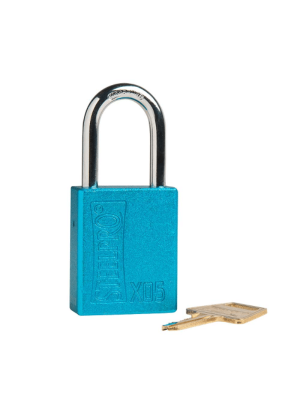 Candados de bloqueo modelo X-05, Posee una base compuesta de aluminio anodizado de alta visibilidad. Grillete de acero endurecido y cromado, Cilindro de bronce de 6 pins. Altura de 32 milímetros de grillete.