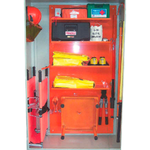 Gabinete de Rescate y Primeros Auxilios, especialmente diseñado para proveer al usuario todos los implementos e insumos de forma accesible, ordenada y en un solo lugar, en caso de un accidente con líneas energizadas, accidentes eléctricos, en donde el tiempo de respuesta es fundamental.